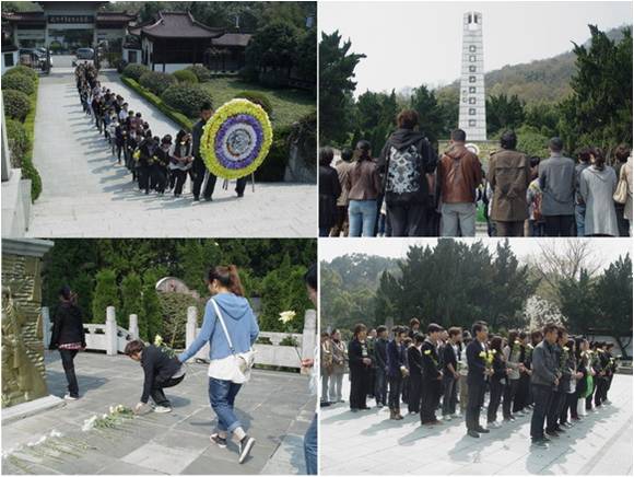 南山陵园建于1951年,是目前唯一在杭州主城区内的公墓。站在陵园烈士纪念碑前,师生手持黄菊、庄严而肃穆。在哀乐的奏响声中,两名学生代表向纪念碑敬献花圈。全体师生默哀三分钟,于静默中缅怀先烈们的无上伟绩,告慰先烈,祭奠英灵。
