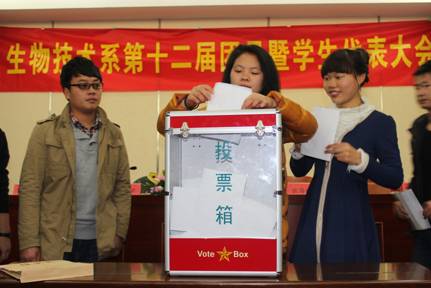 在章健和包子晨同学分别代表第十一届团总支和学生会作了工作报告后,23名候选人分别上台作了三分钟的精彩竞选演说。演说结束,大会严格按照组织程序,在总监票人、监票人的监督下,采用无记名投票差额选举办法,经过紧张、热烈而有序地投票、计票环节,从23名候选人中选举产生了系团总支、学生会的新一届19名成员。同时,2011级的团学干部成员还为即将离任的2010级团学干部送上了精心准备的礼品,也充分展示了生物技术系团总支、学生会相亲相爱如一家人的和谐氛围,为新的团学干部留下了很好的榜样。