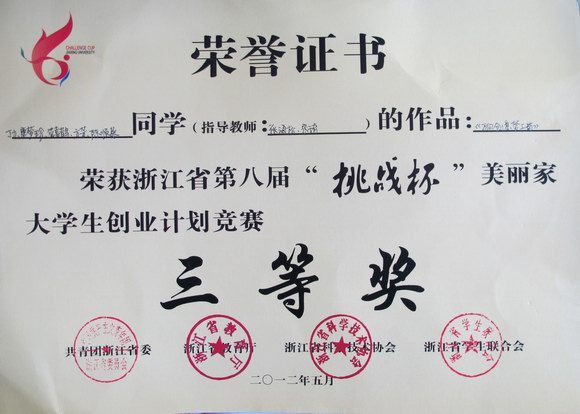 “挑战杯”创业计划竞赛是团省委、省教育厅、省科协、省学联等为培养浙江省大学生的创新意识、创意思维、创造能力和创业精神而联合举办的,众多本科院校都参加了本次竞赛,因此相对水平较高,竞争激烈。我院生物技术系学生作为高职院校大专生与其他高校的本科生、硕士生以及博士生一同竞赛,通过团结协作,共同努力取得了三等奖实属不易。