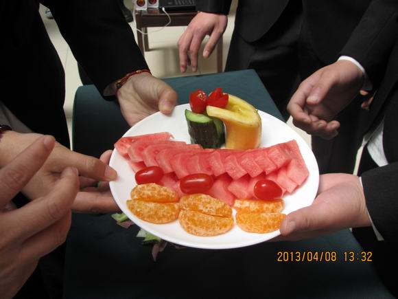 此次大赛分为礼仪姿态、水果拼盘和知识问答三个部分,分别从专业技能和专业知识两个层面对参赛者进行考察。我系酒店专业在校7个班级均参加了比赛,其中,水果拼盘创意大赛获得了评委老师的一致好评,各参赛团队选手团结合作、大胆创新,创作出各自精美的果盘作品。最终,在激烈的比拼之下,综合三方面的得分,酒店111、酒店122和酒店123班分别获得了此次大赛的一、二、三等奖。