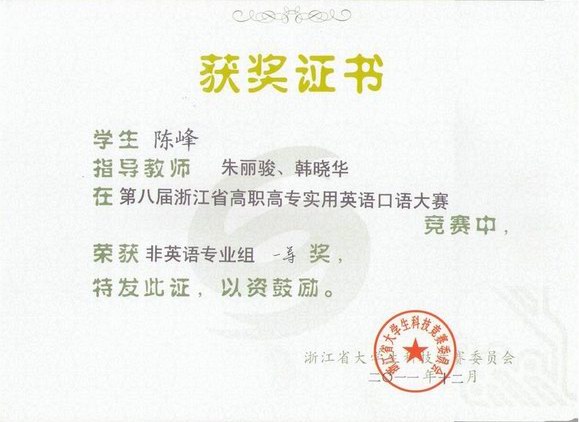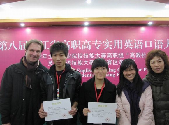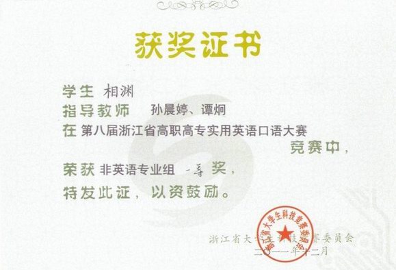 12月9-10日,第八届浙江省高职高专实用英语口语大赛在浙江金华职业技术学院隆重举行。来自51所高职院校的97名非英语专业选手参加了这次比赛,我院选手经过2天的激烈角逐,两名选手总分分别位列97名选手中的第三、第四名,总分排名位列51所高职院校中的第二位,机电一体化专业09-3班的陈峰、城市轨道交通专业09-2班的相渊同学双双荣获“一等奖”的好成绩。