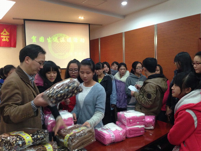 随后,在小报告厅系副主任桑胜华老师到会表达了对贫困生的关心,希望同学们做一个自信、自立、自强有奋斗目标的人,要以学习为重,不断提高自己的能力与水平,只有自强不息,才会改变命运。最后,桑主任向每位同学递送了温暖的毯子衣。