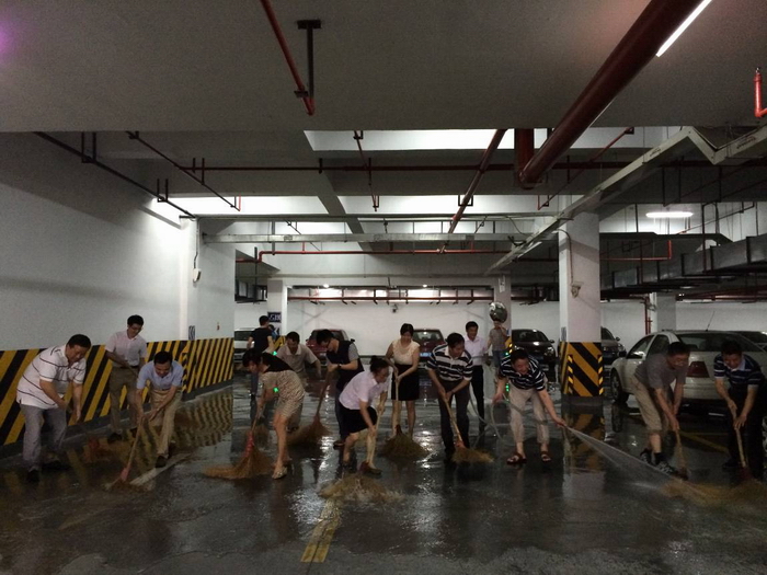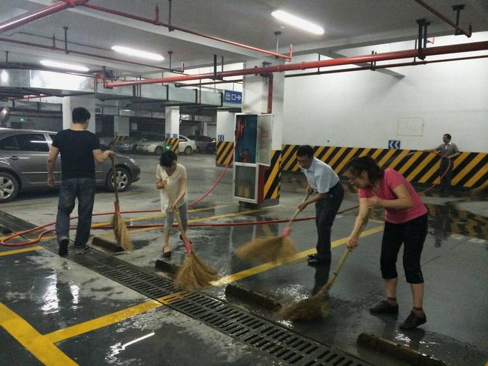 为迎接“7.1”党的生日,美化师生工作环境,6月9日,机关总支组织全体党员、干部义务劳动,重点对新校区地下停车场卫生死角进行清扫。机关总支是学院党员人数最多的一个总支部,同时也集中了学院各职能部门中的骨干力量。在学院领导的身先士卒,率先垂范下,总支党员和国都物业的员工们一起利用中午休息时间,拿着水管、扫把、抹布、铲子、等工具对近千平米地下停车场进行了彻底的清洗打扫。党员同志们个个认真负责,干劲十足,经过一个多小时齐心努力,新校区地下停车场焕然一新。
