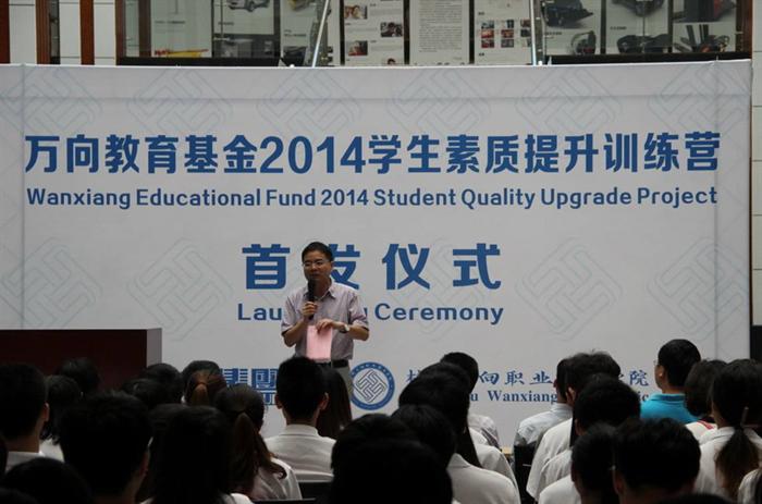 2014年7月4日早上10点,万向教育基金2014学生素质提升训练营启动仪式在新校区图书馆大厅隆重举行。学院院长吴延熊教授、副院长张利老师、财务处处长金耸影女士、图书馆馆长邵魁德老师、学生发展处处长杨人卫老师、副处长严鹏老师、工商管理系副主任桑胜华老师、应用工程系副主任姚林老师、生物技术系副主任应瑶老师、学生素质提升训练营十二名带队教师和参加本次训练营的120名学生参加了首发仪式,仪式由学生发展处副处长徐佩兰老师主持。