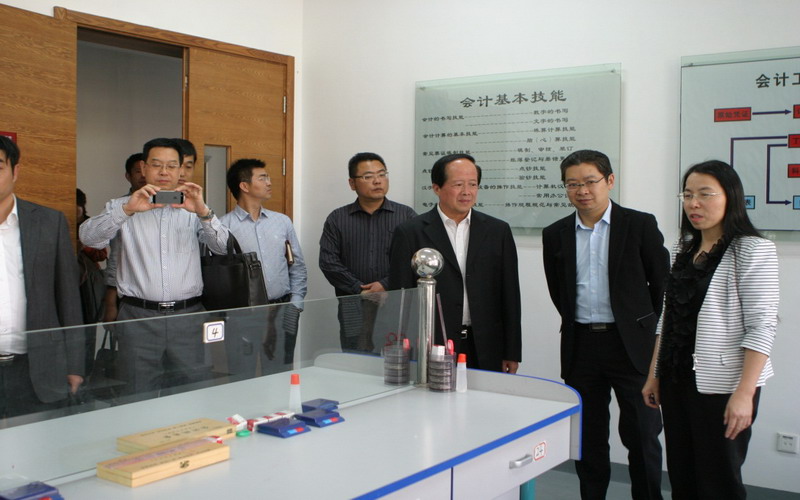 图2:朱仁学副院长陪洪致平院长等考察团成员参观国贸专业实训室