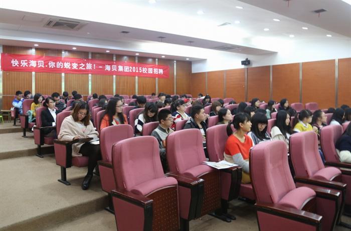 2014年11月10日,我校老校区报告厅传来了一阵阵欢笑声。一场别开生面的招聘会正在报告厅内如火如荼的举行。此次在我校举办招聘会的为浙江海贝服饰有限公司。此公司总部位处杭州,是一家集研发、营销、信息、物流于一体的全国知名服装企业。本次在我校招聘营销物流储备员、数据分析员等岗位,吸引了我校各专业学生到场。