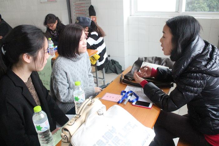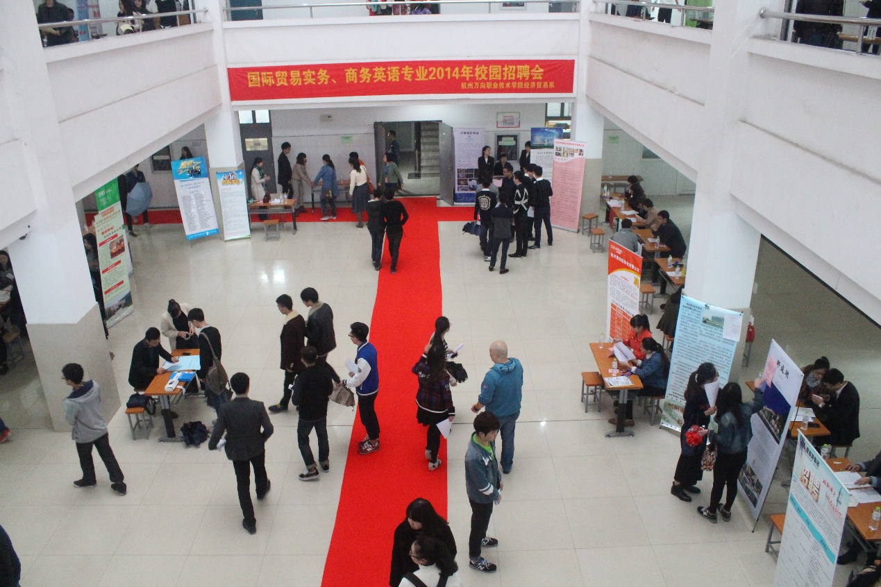 经济贸易系国际贸易实务、商务英语专业2014年校园招聘会在学系主任高兰,副主任张磊老师的统筹下于2014年11月24日在老校区第一教学楼大厅顺利举行。经过前期的邮件及电话联系确认53家就业单位参与此次招聘会。最终共48家企业来到会场。下午1点30分,各企业已经陆续在指定的位置准备完毕,招聘会正式开始,146名2012级国际贸易实务和商务英语专业的学生在两位专业带头人律岚老师和唐夏韵老师的带领下进入招聘会场,同学们带着自己精心准备的简历,认真观察每家单位的招聘要求,并与招聘人员详细交谈。虽然招聘会场外下着雨,但是招聘会场内气氛热烈。招聘会一直持续到下午4点。