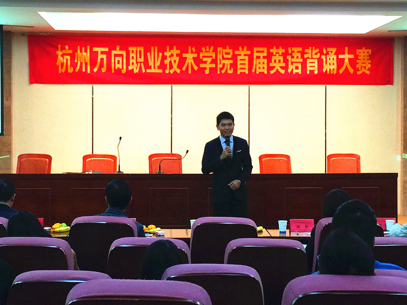 比赛伊始,或许是刚踏上舞台,不少选手都难掩紧张,但是他们都很快调整好了自己的心态,为现场观众展示了自己的风采。有的选手们还精心准备了与背诵内容相关的幻灯片以及背景音乐,以丰富内容展现个性。更有选手增加了才艺表演,或朗诵或唱歌,给在座的评委及观众们带来了一场饕餮盛宴。经过激烈的角逐,胡凯达同学一路过关斩将,凭借其娴熟的语言技巧和稳定的发挥,获得本次大赛一等奖,张俊超、邱爽同学获得大赛二等奖,郑丽雅、庄盼盼、盛敏同学获得三等奖,另有9名同学获优胜奖。最后,评委代表韩晓华老师和Bryce老师对参赛选手的整体表现作了中肯的点评,指出了选手们的缺点和不足,鼓励他们再接再厉,以取得更好的成绩。