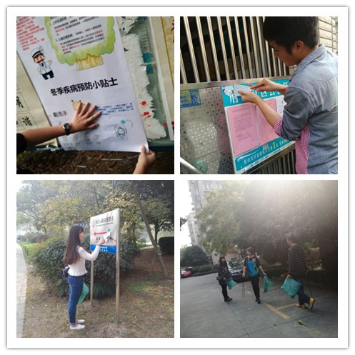 同学们在府苑新村宣传健康知识,并帮助社区清理楼道和绿化区。大家认真的工作态度和良好的工作表现得到了社区工作人员的高度赞扬和肯定。
