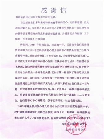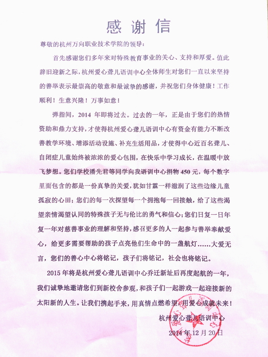 2015年1月8日,我院经济贸易系收到一封来自杭州爱心聋儿语训中心的感谢信。信中杭州爱心聋儿语训中心对我院经济贸易系四年来给予语训中心的支持表示感谢,同时对于志愿者们的无私奉献精神给予肯定。
