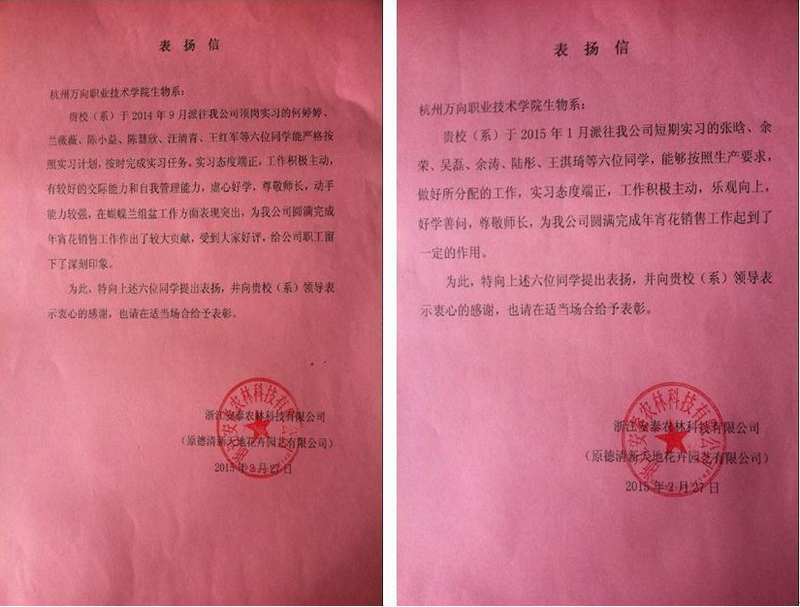 开学伊始,浙江安泰农林科技有限公司(原德清新天地花卉园艺有限公司)向我院发来表扬信。信中对我院生物技术系12位同学在该公司顶岗实习的表现给予高度评价,并向我院(系)对该公司的长期支持表示感谢。