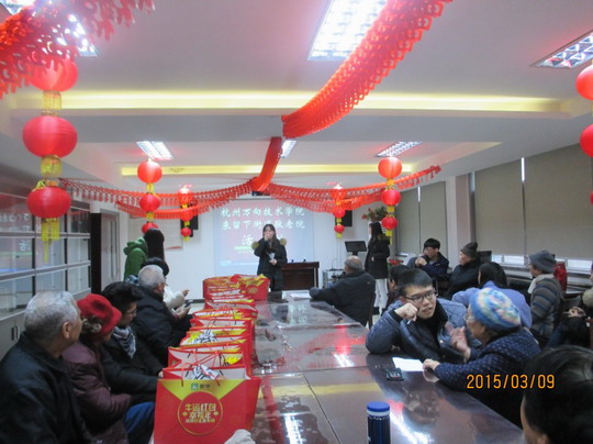为发扬中华民族尊老爱老传统美德,增强当代大学生的社会责任感,2015年3月9日下午,我系辅导员带领团总支学生会11名干部来到工商管理系社区服务基地――西湖区留下养老服务中心慰问老人们,给他们送去新春慰问品和节日的关怀。