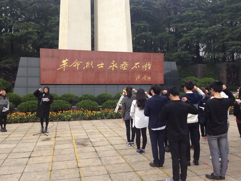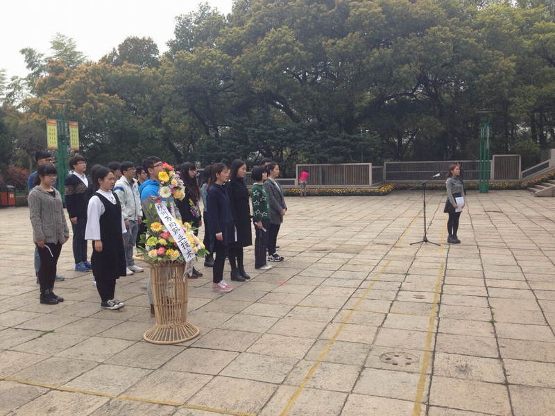 全体人员首先怀着崇敬的心情携花篮来到烈士纪念碑前。接着全体肃立,奏唱《中华人民共和国国歌》,然后带队老师上前敬献花圈,整理挽联。全体成员面对纪念碑,深深的三鞠躬,团总支副书记金苏燕同学代表经贸系团学干部作了发言,学生会主席高欣同学带领大家在纪念碑前宣誓,继承先烈遗志,发扬革命精神,努力做好新时期建设和实现中国梦的接班人。最后公祭仪式结束,同学们整齐有序的环纪念碑一圈,瞻仰烈士纪念碑。