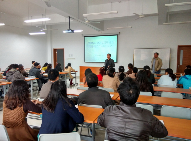 4月13日下午,在新校区7210教室召开了2014、2012届毕业生跟踪调查动员大会。学院副院长朱仁学教授、各专业学系分管学生工作副主任、各系分管就业工作的辅导员以及2014、2012届毕业班全体班主任将近百余人参加了会议。会议由学生发展处处长杨人卫主持。
