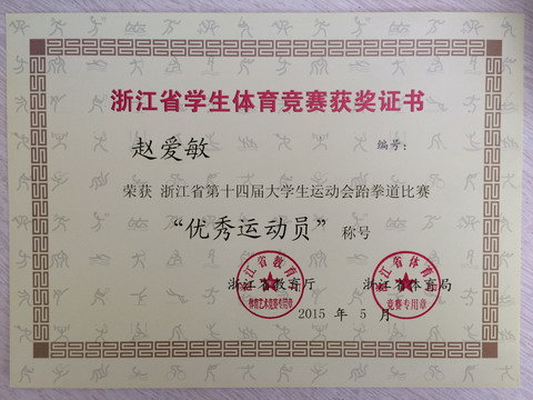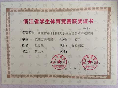 我院工商管理系涉外旅游13-1班张艺耀同学、会计14-4班赵爱敏同学在通识教育系朱伟莉老师的带领下参加了此次比赛。经过二天紧张激烈的比赛,运动员们克服伤痛、勇猛顽强、奋力拼搏,最终赵爱敏同学勇夺女子乙组57kg级亚军,并荣获“优秀运动员”称号,为学校争得了荣誉。