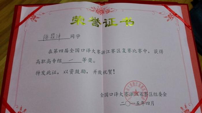 我院经济贸易系商务英语专业陈�D沣同学在比赛中奋勇拼搏,经过英译汉、汉译英二轮比赛的艰苦比拼,力克群雄,最终喜获“全国英语口译大赛浙江赛区高职高专组一等奖”、“全国英语口译大赛浙江赛区三等奖”的佳绩,并为我校获得“全国英语口译大赛浙江赛区2015年度高职组团体前十强”的荣誉。