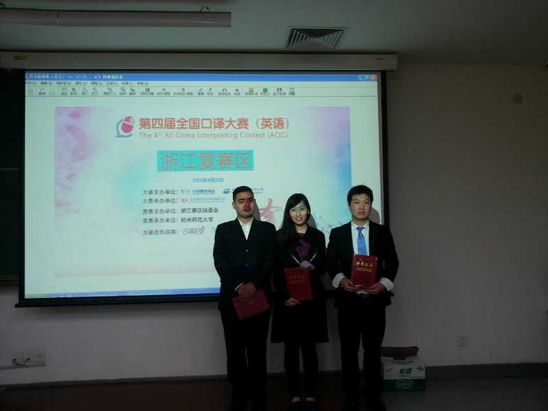 2015年4月12日,第四届全国英语口译大赛(浙江赛区)复赛在杭州师范大学仓前校区举行。本届大赛由中国翻译协会、中国对外翻译出版有限公司主办,杭州师范大学协办。大赛采用同一赛题、同一标准,高职生、本科生、研究生同台竞技。