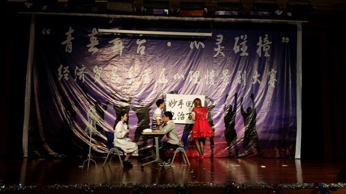 6月11日晚6点20分,以“青春舞台・心灵碰撞”为主题的经济贸易系首届心理情景剧大赛在我院新校区小报告厅隆重举行。经济贸易系主任高兰教授,学生发展处处长杨人卫老师,学生发展处副处长徐佩兰、严鹏老师,经济贸易系副主任张磊老师,学院团委书记范婷婷老师,学生事务中心主任方烨枫老师,学院心理健康指导中心罗琴老师,系辅导员、班主任以及400余名观众共同观看了本次大赛。