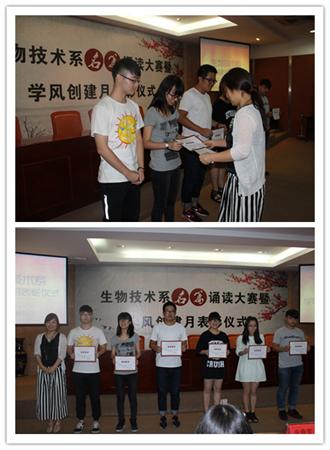 为进一步规范学生日常行为,强化纪律观念,促进优良学风的形成,生物技术系自5月26日起开展了“抓班风,促学风”为主题的学风创建月系列活动。该活动包括宣传动员、活动实施以及总结评比三个阶段,内容涉及读书节、学风座谈会、“诚信考试、拒绝作弊”主题教育活动及学风创建主题班会等。