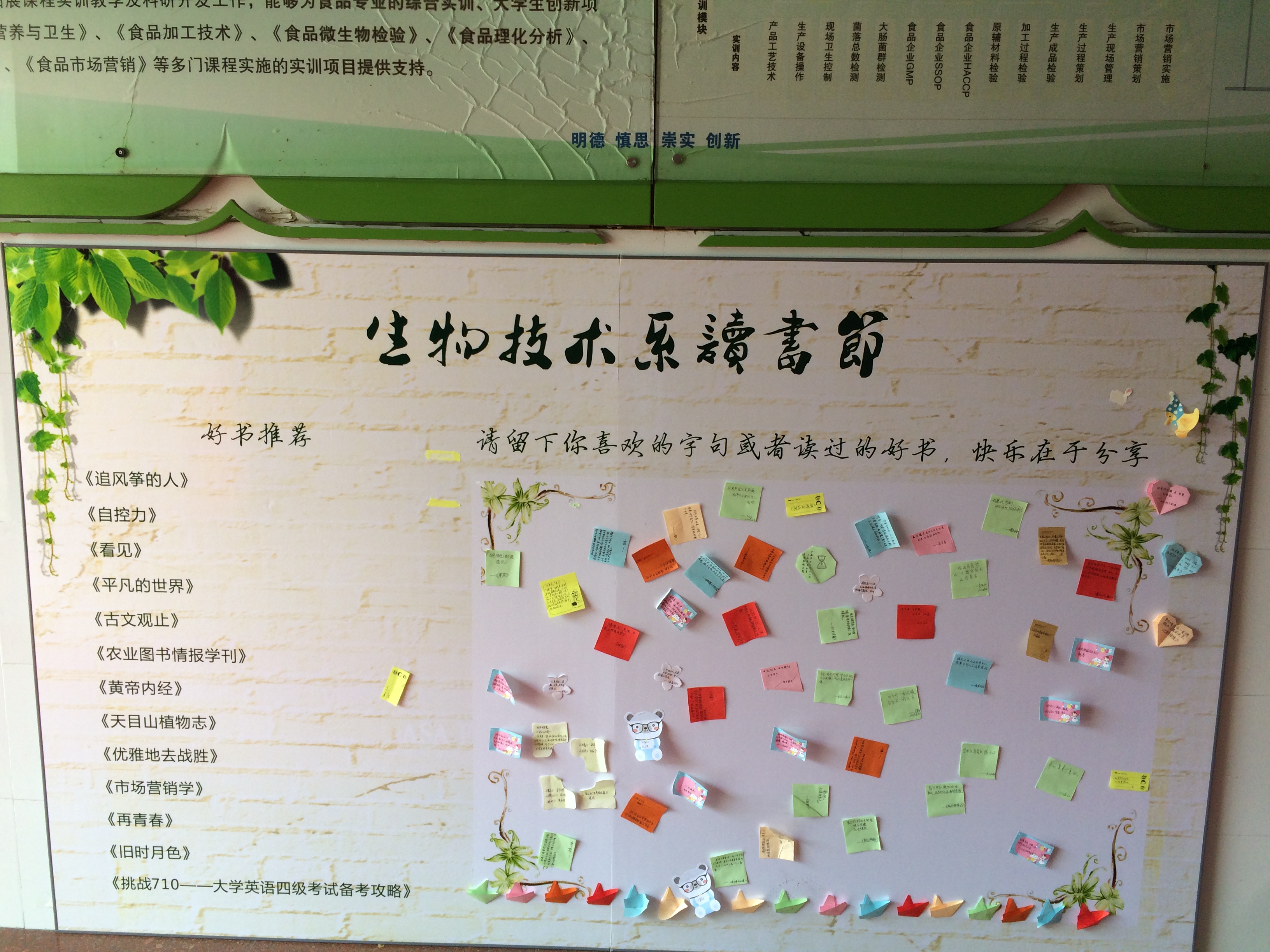 为了让更多同学接触好书,同时分享自己读过的好书,系里将推荐书目做成了展板,并在展板设置空位让同学们留下自己想推荐的书籍及读到过的好句子。展板放置之后得到了大家的积极响应,不到一周就贴满了留言。