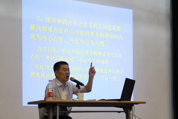 郑仓元教授从培育和践行社会主义核心价值观的意义、社会主义核心价值体系和核心价值观的内容、如何正确认识和努力践行社会主义核心价值观等三个层面进行了精彩、生动的解读。指出培育和践行社会主义核心价值观是多元价值时代形成价值共识,促进社会和谐的精神基础,是提高全民族文明素质的客观需要,是应对意识形态工作面临严峻形势和挑战的需要;强调培育和践行社会主义核心价值观是一个具体的历史过程,其根本目的是促进社会和谐、提升人的素质,面临的挑战是阶层的固化,解决的难点是核心价值的基本精神如何内敛为内心自觉、外化为行为习惯,重要途径是加强自身修养。