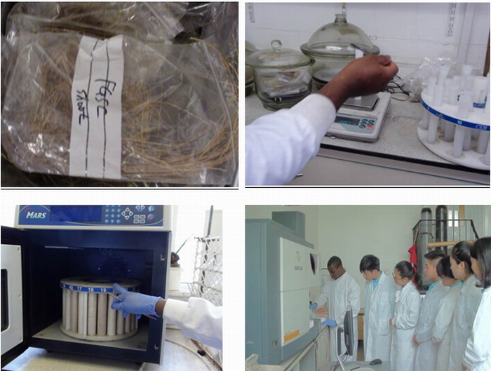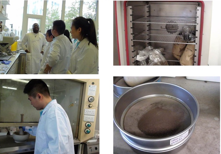 进实验室前秦博士给我们做了实验室安全讲解,给每位同学配备实验服和实验用手套。接着Obinna博士对着XRF仪器给我们详细讲解XRF(XRay Fluorescence)测试原理、样品预处理方法与测试步骤,随后我们分别动手开始实验:样品磨细――过筛――样品盒装膜――称样――样品盒置于仪器中――4分钟后数据逐一显示。