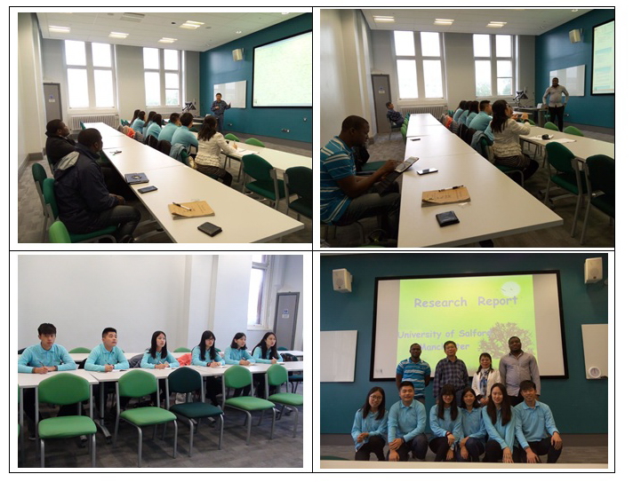 我们怀着激动而兴奋的心情走进了University of Salford的Peel Building教室,认真聆听林教授讲解英国环境污染历史与污染治理措施,我们由此了解到工业革命给曼彻斯特留下环境“疤痕”,现在曼彻斯特运河的水底仍残留许多污染物质,这些污染物质污染和影响着现在的运河水质。通过Enya博士的“生态系统中碳与土壤有机物相关性研究”、Obinna博士的“垃圾填埋场土壤污染研究”、秦博士的“运河水质污染监测与治理”课题介绍,我们不仅分享和交流了他们的研究成果,而且深深折服他们的科研态度与探究精神,同时我们也明白了接下来我们实习中的主要学习内容和学习项目。
