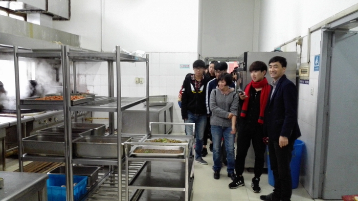活动开始,学院商世能院长助理发表了热情扬溢的讲话,他高度表扬了容大食堂近年来在食品安全方面做的努力和成绩。接着容大餐厅张勇经理带领大家参观了食堂的后台。平时看不见的食堂后台分为清洗间、保洁间、面点间、烹饪间等多个专门分工的房间。早上买好的菜一般直接送来进行初加工,随后送去清洗间清洗,荤菜、蔬菜、水产都有单独的洗菜池,分开洗涤保证卫生,之后进行切配,再进行烹调,端到备菜间等待上菜。