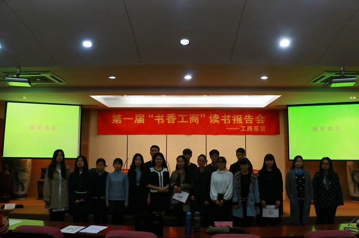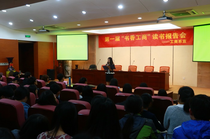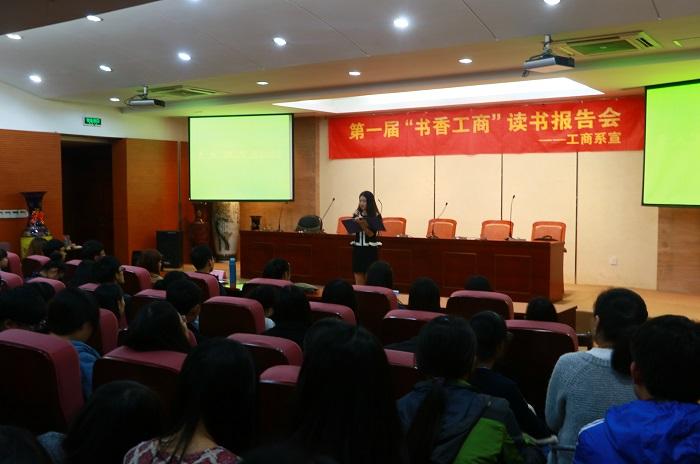 为了营造我系良好读书氛围,促进学风建设,倡导读书文化,引导广大团员青年多读书、善读书、读好书,我系团总支特举办第一届“书香工商”读书报告会。11月24日晚6点,报告会在老校区报告厅如火如荼的展开,系团总支书记许一鸣老师、学院办公室张瑞老师出席并担任比赛评委。