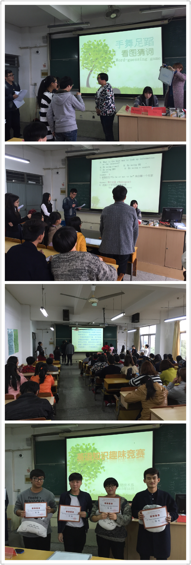 竞赛分为四个环节,“我爱记单词”――单词默写,即抽签决定默写环节的单词首字母,两分钟内写出最多正确的单词。第二环节是“知识问答”――参赛选手回答五道必答题,十道抢答题,题目内容全面,涵盖:文学、数学、地理、影视、美食等内容。答题过程中,同学们热情高涨。特别是“手舞足蹈”猜词游戏这一环节,充分体现了小组内部成员间的默契和团队合作精神。最后,进行了观众互动环节,观众们踊跃参加答题,并赢得了小奖品,将比赛又一次推向了高潮。