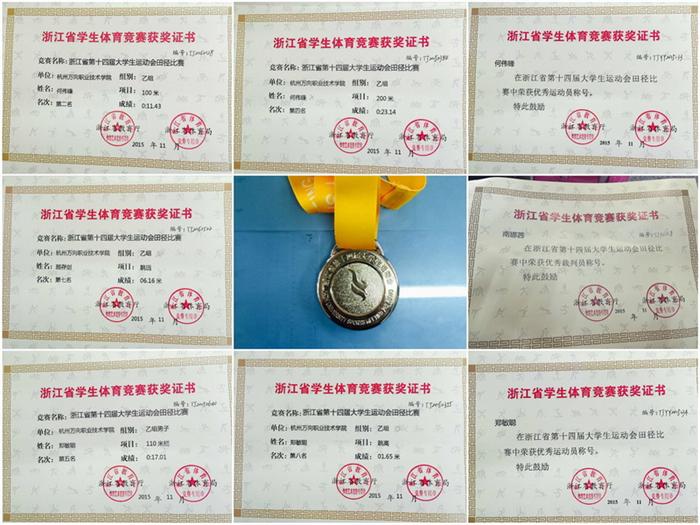 11月13日下午,浙江省第十四届大学生运动会田径比赛在温州大学圆满闭幕,来自全省78所高校(其中高职高专院校42所)1178名运动员参加了本届大运会田径比赛。我院共派出8名运动员参赛,在为期5天的比赛中不畏艰难困苦,奋勇拼搏,喜获佳绩。城轨14-1班何伟峰同学获得男子乙组100米亚军、200米第四名,并荣获“优秀运动员”称号;汽修13-1班郑敏聪同学获得男子乙组110米高栏第五名、跳高第八名,并荣获“优秀运动员”称号;食品13-1班顾存剑同学获得男子乙组跳远第七名。此外通识教育系南娜茜老师担任本届赛事的裁判工作,荣获“浙江省第十四届大学生运动会田径比赛优秀裁判员”称号。