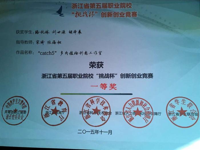 从本次大赛初赛开始,我院团委积极动员全院学生参加此次“挑战杯”创新创业竞赛。许多同学热情高涨,纷纷组队参赛,指导老师不辞辛苦,积极指导参赛队伍。经过学院选拔和大赛评审委员会评审,最终生物技术系两个项目代表学院入围总决赛,经过决赛答辩,宋琦、张海松老师指导,路杭林等同学的“catch5多肉植物创意工作室”项目荣获一等奖;张学兵、邹礼根、张海松老师指导,陈杏芬等同学的“低盐咸蛋加工新工艺研究”项目荣获二等奖。