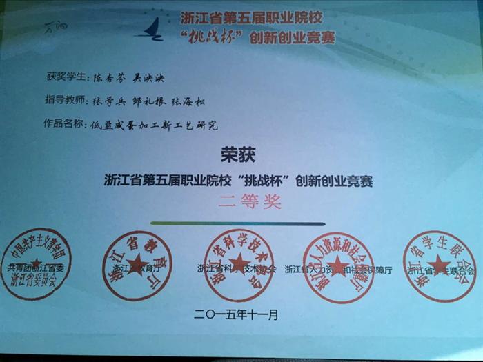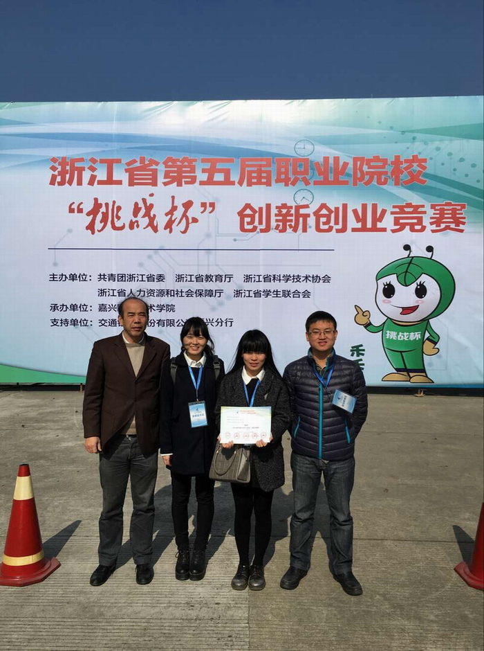 近日,由共青团浙江省委、浙江省教育厅、浙江省科学技术协会、浙江省人力资源和社会保障厅、浙江省学生联合会联合举办的浙江省第五届职业院校“挑战杯”创新创业竞赛总决赛在嘉兴职业技术学院落下帷幕,我院生物技术系学生在系主任张海松领队及宋琦、张学兵指导老师的带领下在此次竞赛中分别获创业计划类项目一等奖和生产工艺革新与工作流程优化类项目二等奖各一项。