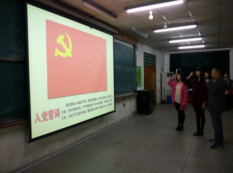11月16日晚,我院业余党校2015年第二期业入党积极分子培训班在老校区实验楼601教室正式开课。在嘹亮的国歌声后,由学院党委组织委员商世能同志带领新发展的预备党员面向党旗庄严宣誓,拉开了培训班的序幕。