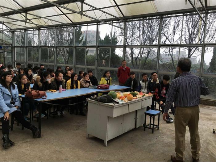 2015年11月30日上午10时,生物技术系邀请日本园艺专家西村润在学院玻璃温室为园艺技术专业师生做“水果形态及多倍体水果繁育”专题培训。生物技术系张海松主任、园艺技术团队部分教师及园艺技术专业学生共50余人参加了本次专题培训。