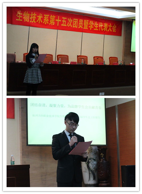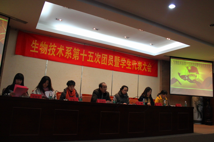 大会在庄严的国歌和共青团团歌声中隆重拉开帷幕,生物技术系主任张海松老师致开幕词。大会审议并通过了张倩雯老师代表第十四届团总支及沈钊炜同学代表第十四届学生会做的工作报告,报告全面、客观地回顾了一年来我系团总支、学生会的工作,总结成绩,指出不足,提出了今后的工作目标和主要任务。