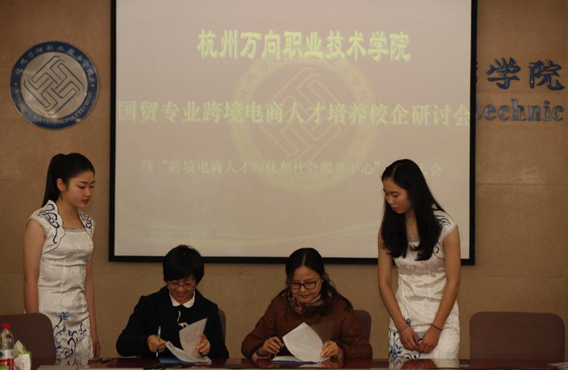 图2.学院副院长张琼与杭州余杭区商务局副局长签订合作协议