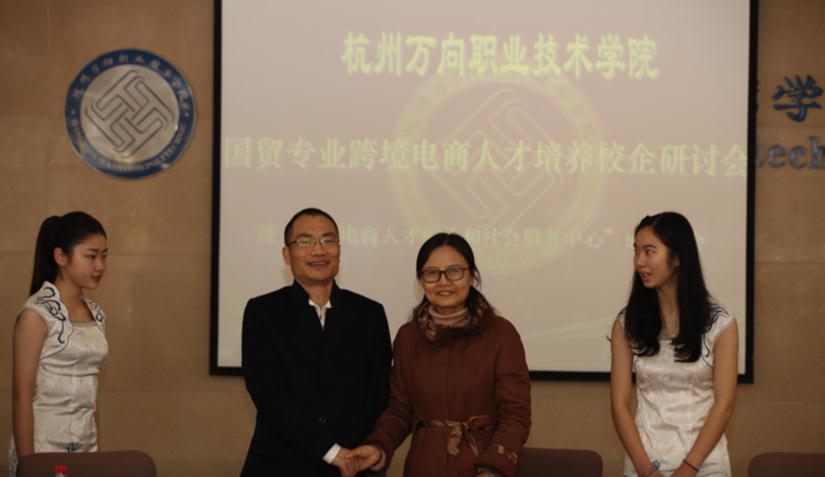 这次跨境电商人才孵化和社会服务中心成立总共涉及合作单位11家,其中政府部门2家、行业协会1家、企业8家,可谓阵势庞大,与学院构成了“政校企行”四位一体的合作体系。参会嘉宾均为合作单位代表,包括杭州余杭区商务局副局长吴宏伟、临安市商务局副局长帅乐芳,临安市跨境电子商务协会秘书长吕小青、杭州万事利丝绸科技有限公司跨境电商经理卫科峰等政府部门、行业、企业的负责人。出席大会的院方人员包括学院副院长张琼教授、经济贸易系主任高兰教授、实训中心主任胡建华、交流合作处副处长李辉等领导和经贸系的全体老师。