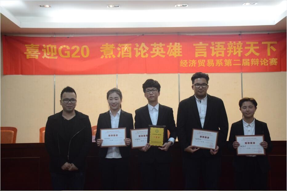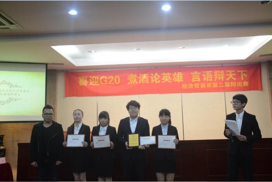 根据学院大力推进全人发展的重要精神,陶冶大学生情操,锻炼同学们的语言组织能力,培养浓厚学习氛围,繁荣校园文化的号召,我系于三月举办了以“喜迎G20煮酒论英雄 言语辩天下”为主题的第二届辩论大赛。本届辩论赛以班级为参赛单位,分三个阶段:第一阶段为小组赛,从参赛的的十支队伍中由两两对决,胜者晋级;第二阶段为半决赛,经过激烈的唇枪舌剑,最终商英152和国贸151成功会师决赛。