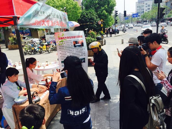 “全民饮茶日”于2012年开始,每年农历谷雨日即成为杭州市的“全民饮茶日”。茶文化是中国魅力和中国文化影响力的重要标识。全民饮茶日活动一直在提升杭州城市文化内涵,展示杭州名茶之都,品质之城,人文之地的独特魅力方面起到了很好的作用。生物技术系茶艺社与其他高校的优秀社团一起参加了主会场的开幕式演出和赠茶活动,并且准备了茶艺、茶文化互动环节与现场群众互动,得到了不错的反响。