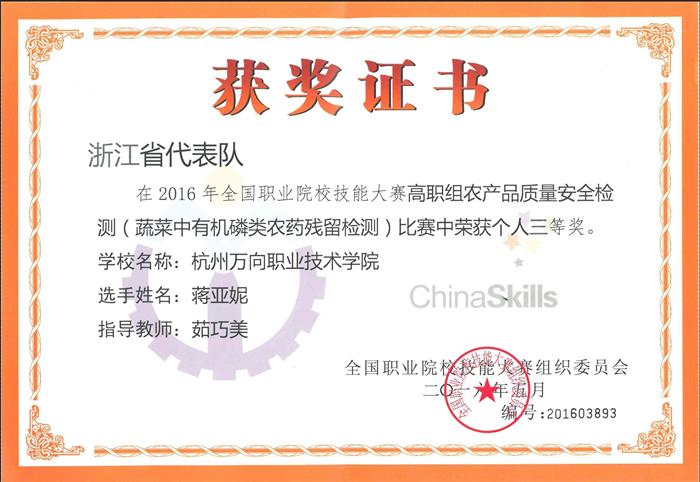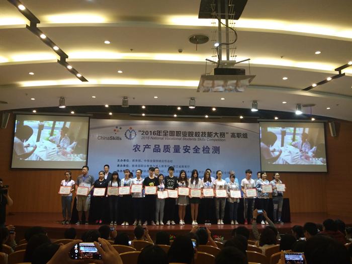 2016年5月19日至5月22日,由浙江省食品安全委员会办公室、浙江省教育厅和浙江省供销合作社联合社主办的2016年全国职业院校技能大赛(高职组)农产品质量安全检测赛项在浙江经贸职业技术学院隆重举行。本次赛事包括蔬菜中有机磷类农药残留的检测、禽畜肉中氟喹诺酮类兽药残留的检测及茶叶中重金属含量检测,全国共有30支代表队167名选手参加该赛项。