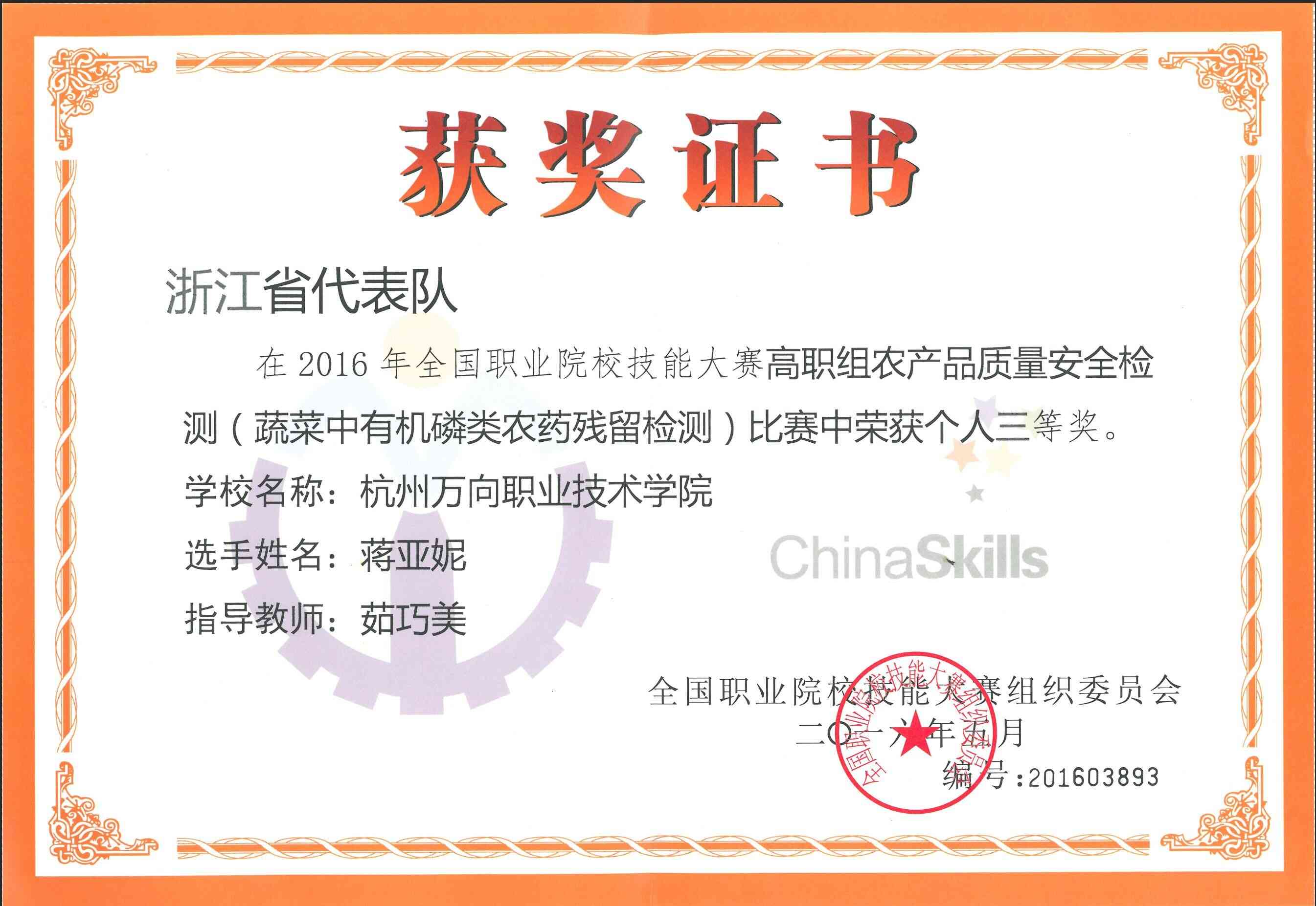 我院绿色食品生产与检验专业蒋亚妮同学经过省赛选拔并喜获一等奖,并代表浙江省参加全国职业院校技能大赛。经过3天激烈角逐,蒋亚妮同学冷静应战,在蔬菜中有机磷类农药残留的检测中喜获三等奖。通过本次的全国职业技能大赛,彰显了我院绿色食品生产与检验专业团队技能大赛历史性突破,争取以后在各项职业技能大赛中再创佳绩!