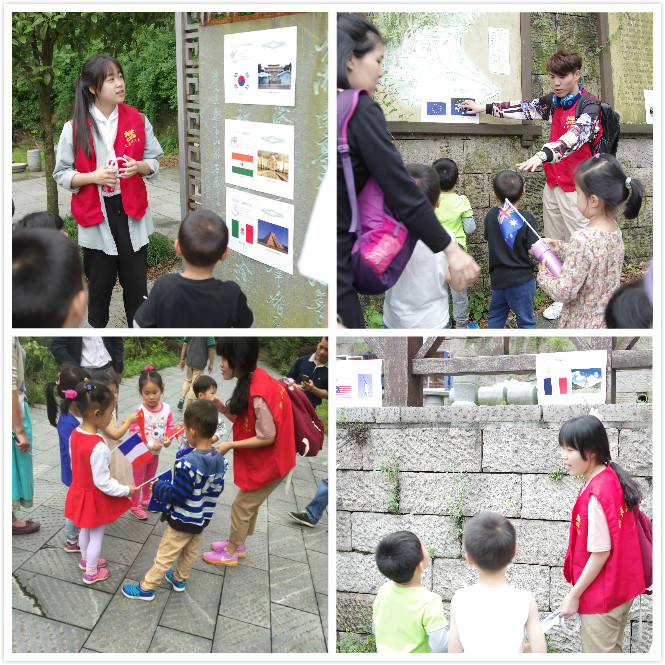 本次活动地点为杭州西溪河边的沿山慢行道,志愿者们在这条总长约4公里的地方设置了“林间幽静”“报先梵音”“松往飞霞”“桃源赏春”四个活动卡点,分别粘贴不同国家(经济体)的海报,当各位小朋友们以及他们家长们来到活动卡点时,志愿者们便用各类形式为他们进行宣讲,如在第一个卡点,他们给小朋友们教起了英文歌“Twinkle Twinkle Little Star...”继而通过简单的歌曲教唱和歌曲简介让他们认识该曲国家的背景;在第二个卡点,志愿者们吹起了一个个漂亮的气球,用它来吸引前来的小朋友学习英文颜色等等。小朋友们在玩中学,学中游,并和志愿者们用起了简单的日常用语如“Hello、Hi....”等做交流。最后在终点处,小朋友抽取20国(经济体)国旗,回答出国名,领取小礼品,活动在一片欢声笑语中结束。