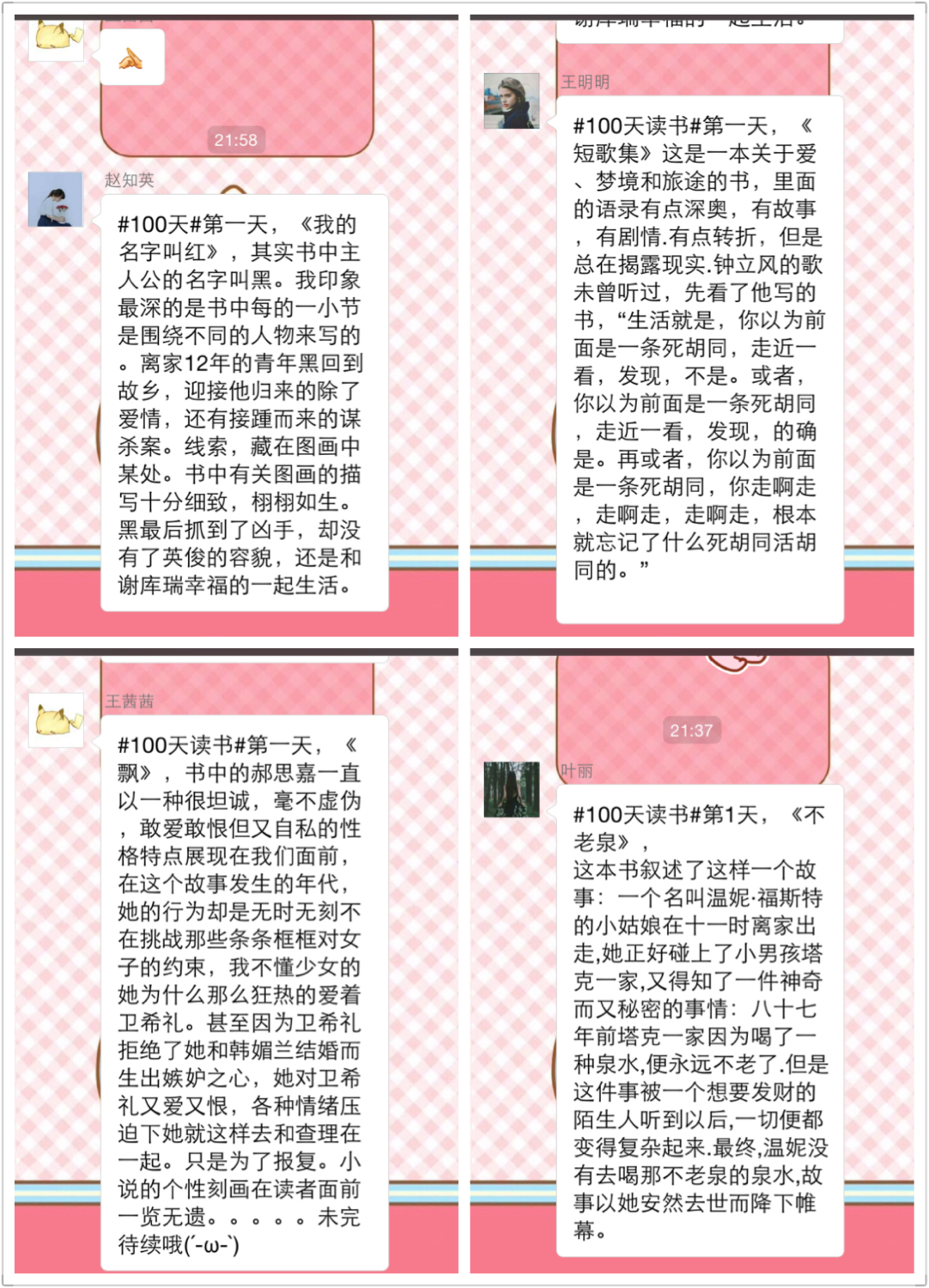 100天读书行动是本次读书节的一大亮点,意在通过新颖的方式激发学生的读书热情。活动形式为参与的同学加入微信群,每天在群内打卡,交流当天的读书心得。活动一推出就得到了积极响应,多名同学加入了读书群并坚持打卡。
