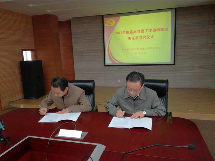 与基层党组织负责人签订年度目标管理责任书,是学院党委抓基层党建工作的重要举措之一,目的是为了深入学习贯彻党的十八大及十八届历次全会精神和习近平总书记系列重要讲话精神,秉承“围绕中心抓党建,抓好党建促发展”的工作宗旨,全面落实浙江省高校思政工作会议提出的各项要求,切实增强全体党员干部的政治意识、大局意识、核心意识和看齐意识。