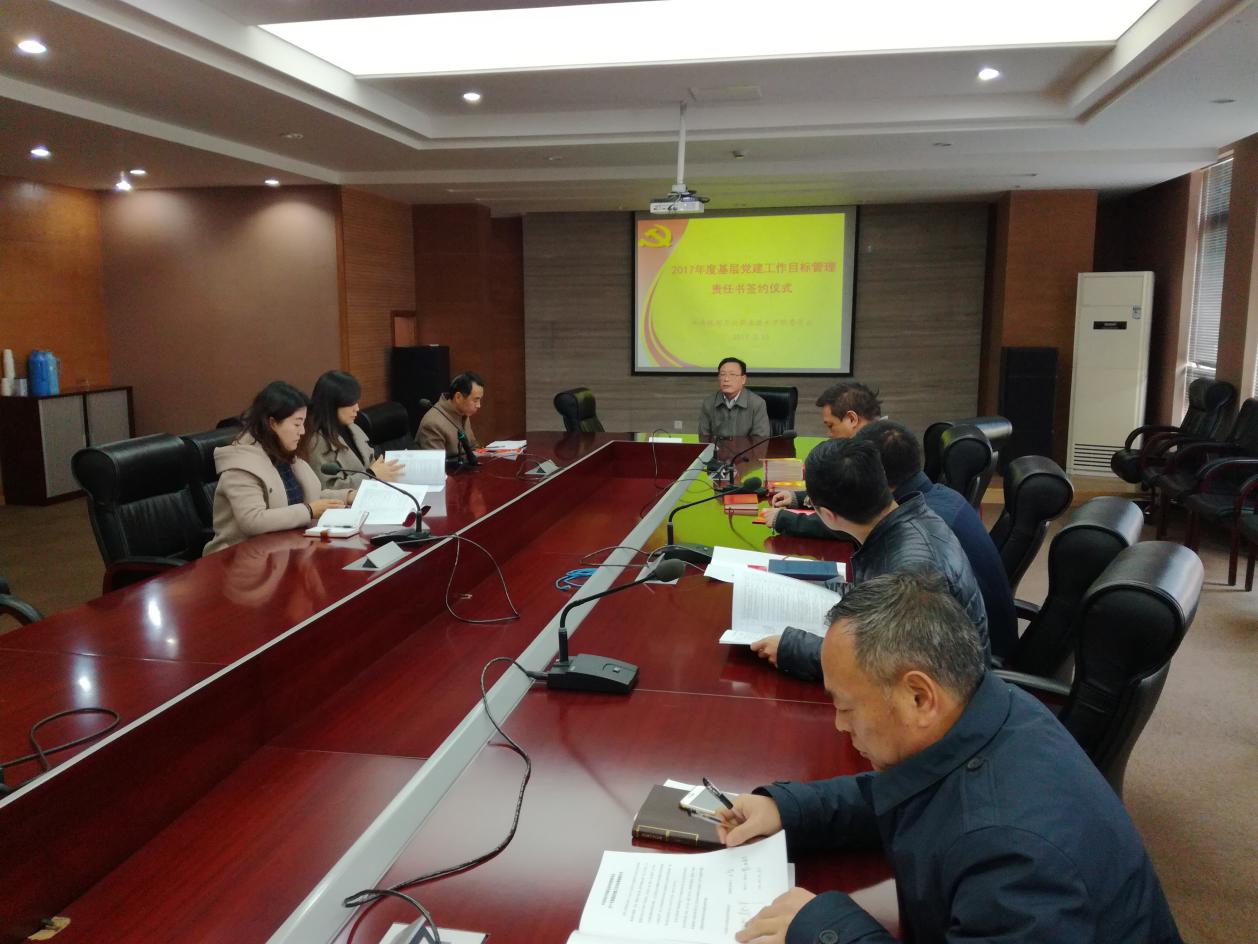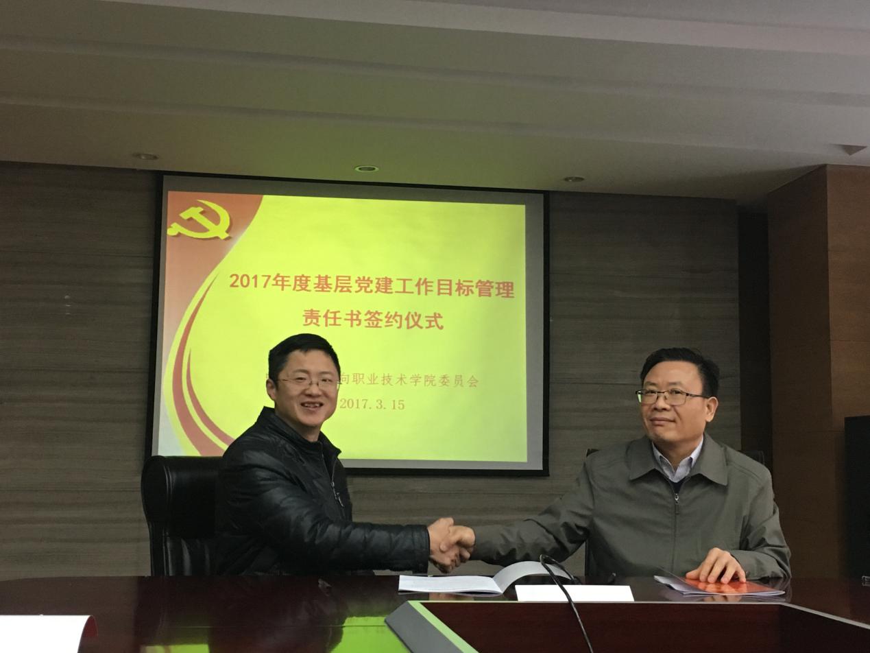 3月15日上午,我院举行2017年度基层党建工作目标管理责任书签约仪式。院党委书记莫晓平同志分别与党委办公室主任、各党总支(直属党支部)书记、团委书记和工会主席等9位同志签订了《2017年度基层党建工作目标管理责任书》。