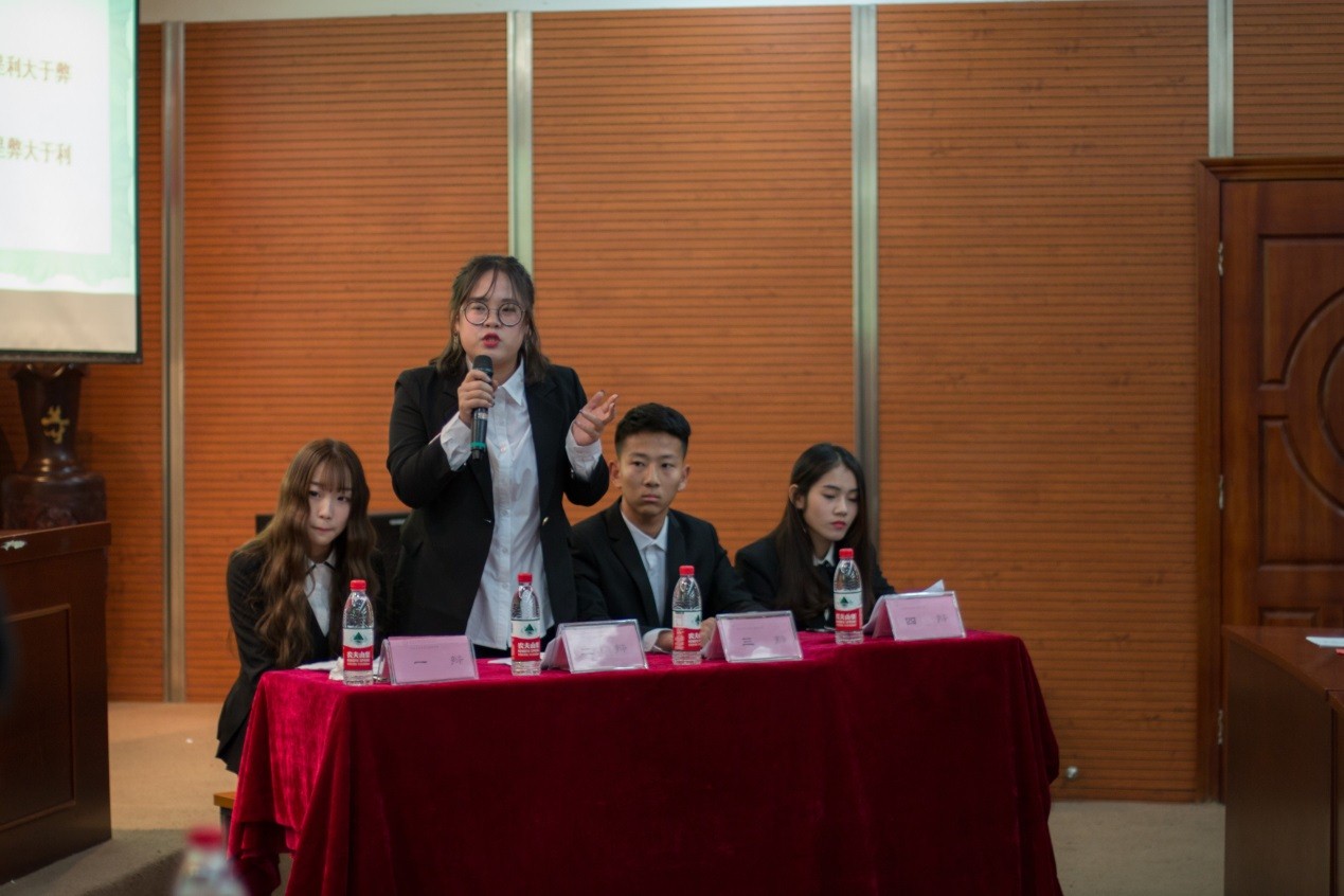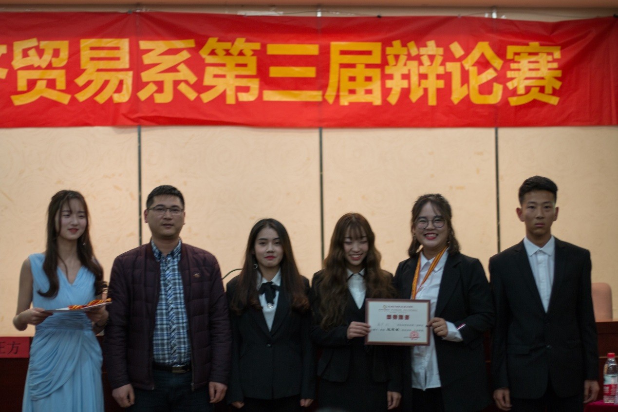 3月28号18:00在老校区小报告区中传出阵阵的鼓掌声,经济贸易系第三届辩论赛的决赛正式打响。经济贸易系副主任郑志柱老师、团总支书记马利国老师、辩论社社长张拓鸣、科技系最佳辩手柏俊华、作为本次决赛的评委。