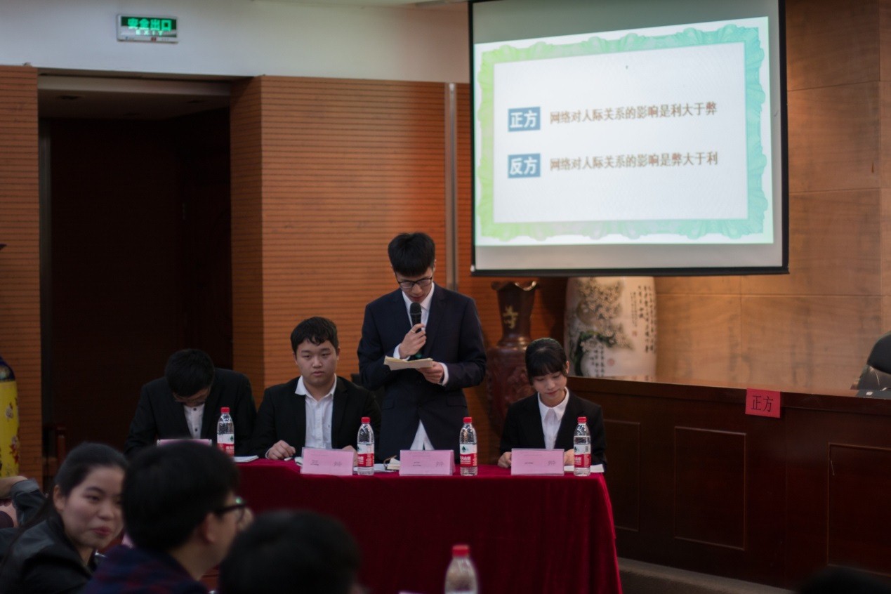 在主持人对比赛流程和规则简短介绍后,辩论赛在观众热烈的掌声中拉开了帷幕。决赛的正方是“网络对人际关系的影响是利大于弊”,反方是“网络对人际关系的影响是弊大于利”。两支队伍在立论,攻辩,自由辩论等各个环节中思路清晰,引经据典,将赛场的气氛进一步推向了高潮。最终房产161班以微弱的优势成功突围获得本次决赛冠军,国贸161班获得亚军,团学代表队获得季军,国贸162获得优秀团队。最佳辩手为房产161罗巧慧、商英162蔡威威、国贸163倪晨翔。