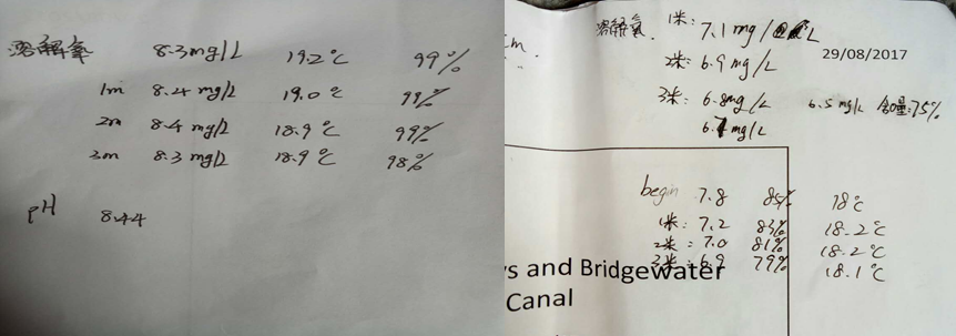 通过对比两个采样点的检测数据,发现Salford Quays的水质要远好过Bridgewater Canal,尤其是溶解氧的含量差距明显。对于两个采样点数据的差异,Natalie博士也耐心地解答了我们的疑问,SalfordQuays的水已经经过多年治理,河中有多个循环曝气系统,所以水质参数要远优于Bridgewater Canal处的水质。在这个过程中,Natalie博士帮助我们了解了许多专业知识,时刻关心着我们的情况,向我们提供了很大的帮助。