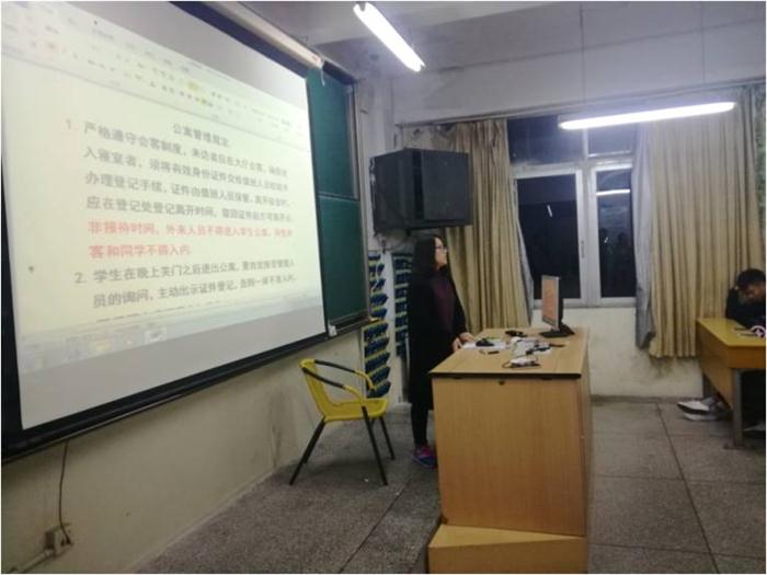 10月24日晚7点,环境健康与食品科技系召开2017级新生班委培训,包括环境监测与控制技术、康复工程技术、绿色食品生产与检验、食品质量与安全、农产品流通与管理、园艺技术6个专业在内的共130余位班委参加了培训。会上系2017级年级辅导员向各位班委讲解了班委各个岗位的职责,并认真听取和回答了同学们的疑问。随后系学生会纪检部部长、生活女生部副部长分别向新生介绍了考勤制度和学生寝室管理制度,使2017级新晋班委对学校的相关管理制度有了更加全面和深入的了解。